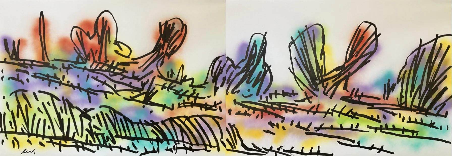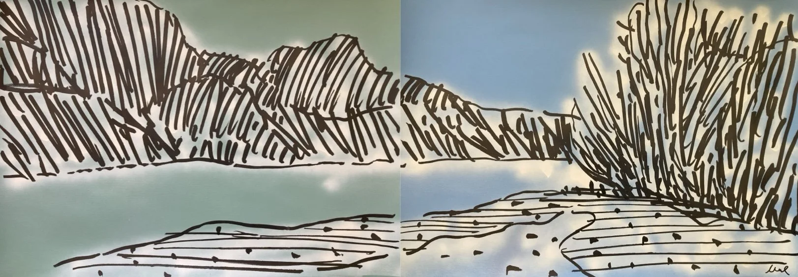 Landscape is a panoramic view, a detail seen on a trip on the highway, a tree, a dead animal, or an oyster shell. In all these possibilities I am interested in their linear rhythms so that I can translate them graphically through gestures.