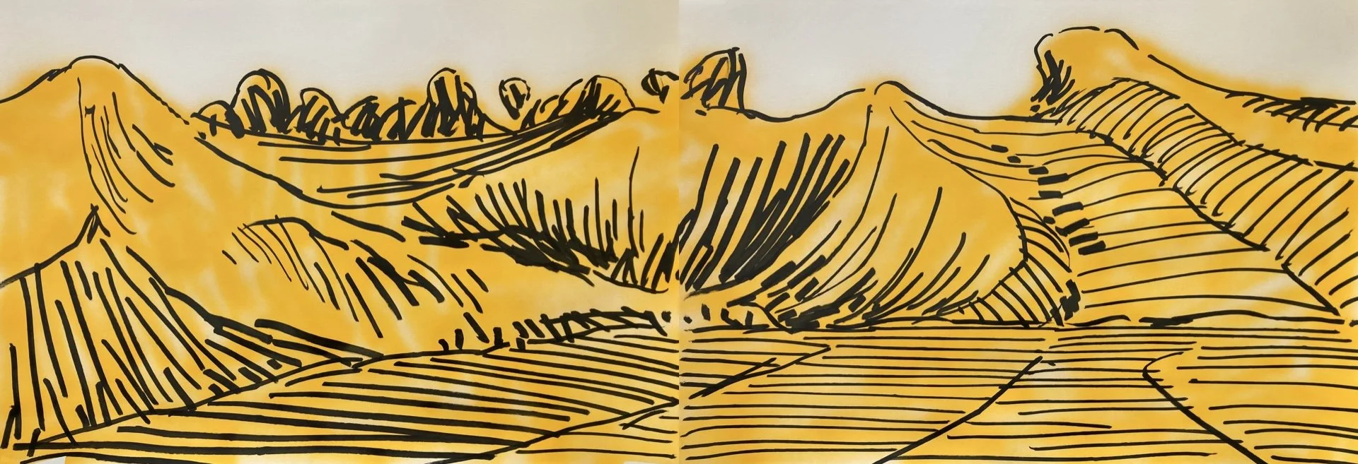 2025, acrylic, marker with Indian ink and wash on paper, 70 x 200 cm